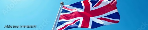 Close-up of colorful British flag fluttering against clear blue sky, emblem, red white blue, tourism