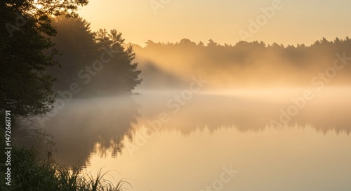 Close-Up of Dew Drops on Leaves with Blurred Misty River Reflection in Background