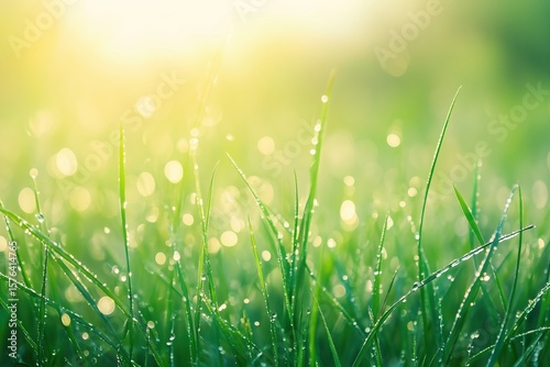 Close-up of green grass blades covered with fresh dew drops, softly lit by warm morning sunlight. The dreamy bokeh in the background enhances the peaceful and refreshing atmosphere of a spring or summ