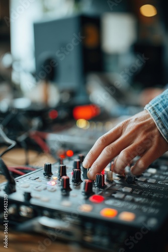 Close-up of Hands Adjusting Audio Interface in Creative Studio