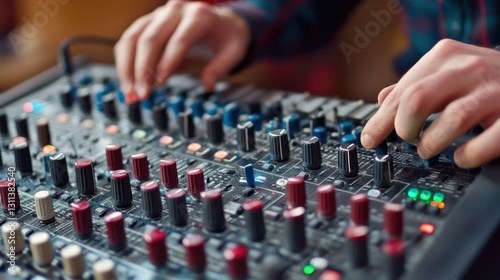 Close-up of hands adjusting audio mixer knobs. Ideal for music production, sound engineering, or DJing concepts.