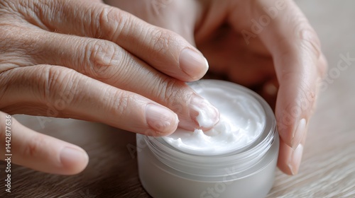 Close-Up of Hands Applying Organic Skincare Product on Wooden Surface for Beauty and Wellness Concept