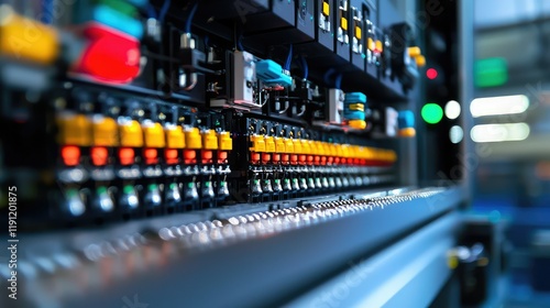Close-Up of Industrial Control Panel with Colorful Switches and Lights