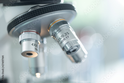 close-up of Microscope lens, science tools microscope in laboratory