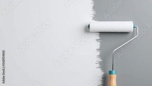 Close-up of paint roller applying fresh color to gray surface, showcasing home improvement and renovation process in action.