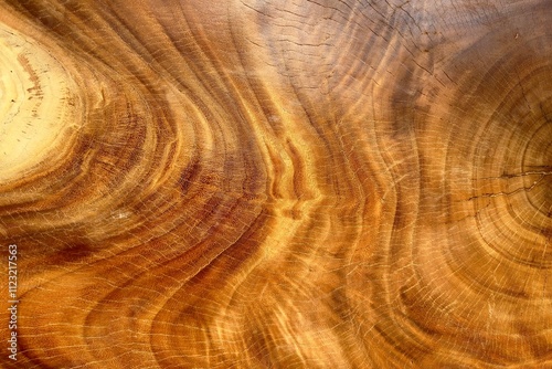 Close-up of the surface of the tamarind wood, emphasizing the rich grain, texture and natural colors. The warm tones and swirling patterns highlight the natural beauty of the wood.