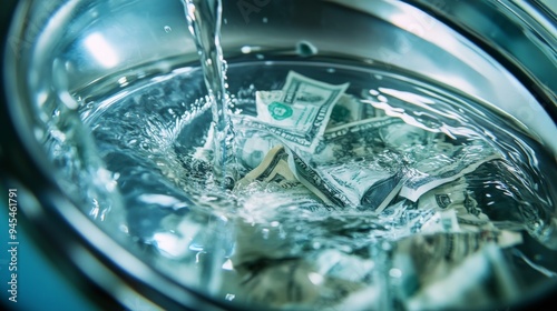 Close-up of various denominations of US dollar bills being washed with water inside a washing machine, illustrating the concept of money laundering in a literal sense.
