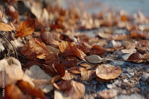Close-up of vibrant autumn leaves scattered on the forest ground, bathed in warm sunlight, showcasing fall colors.