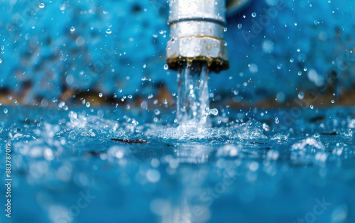 Close-up of water flowing from a pipe with droplets splashing, against a blurred blue background. Refreshing, clean water in motion.