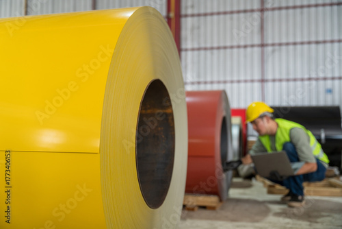 Close-up on a bright yellow metal coil roll in the foreground, with an industrial worker checking quality and inventory in the blurred background of the factory.