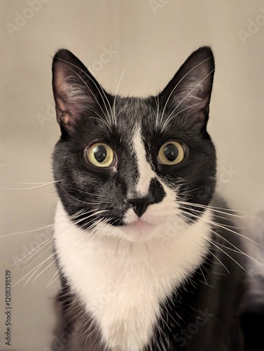Close-Up Portrait of a Black and White Tuxedo Cat with Intense Gaze and Whiskers