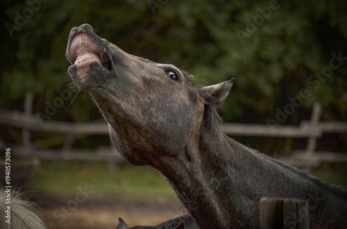 Close-Up Portrait of a Dark Gray Horse with an Expressive Smile