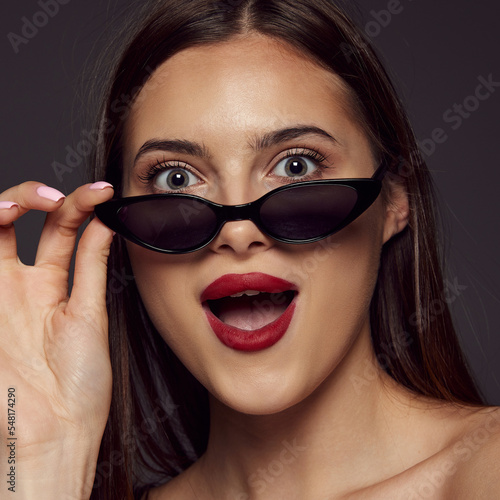 Close-up portrait of young beautiful girl with red lips posing in sunglasses isolated over dark grey background. Concept of beauty, fashion and cosmetology