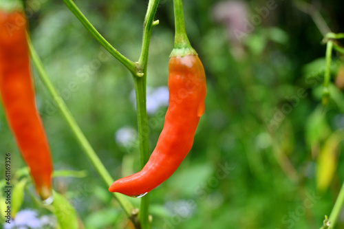 closeup the red ripe chilly with leaves and plant growing in the garden over out of focus green brown background.