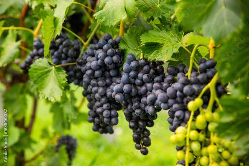 Clusters of Ripe Purple Grapes Hanging on a Vine in a Vineyard