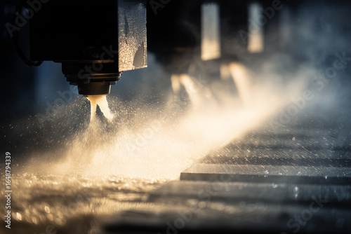CNC加工中の金属切削とスチームをとらえた工業写真