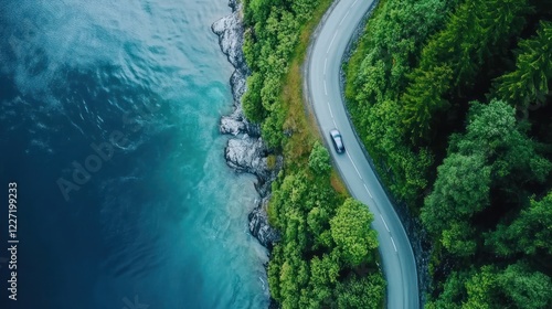 Coastal road trip, car driving scenic route, turquoise water, lush forest