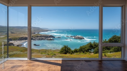 Coastal View from Modern Window Frame with Lush Green Landscape and Vibrant Blue Ocean on a Clear Sunny Day