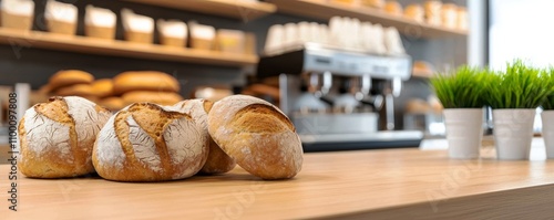 Coffee and bakery espresso freshly baked conceptual. A cozy bakery scene featuring freshly baked bread rolls on a wooden table, with a modern coffee machine and decor in the background.