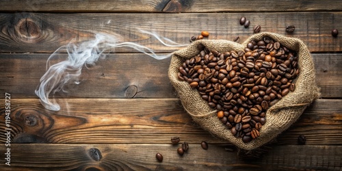 Coffee with heart shape smoke emerging from a burlap sack filled with coffee beans against an old wooden background , heart, rustic
