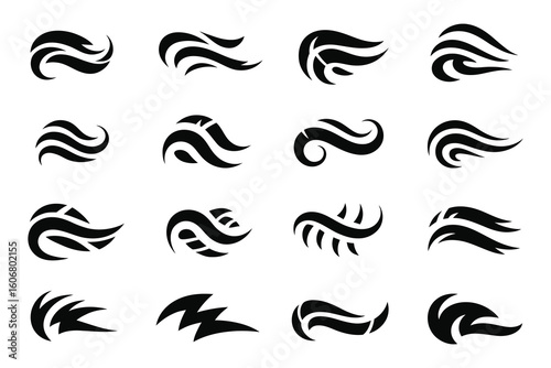 Collection of abstract swirling brush stroke wavy circular shapes, elements, and decorative design motifs on a white background