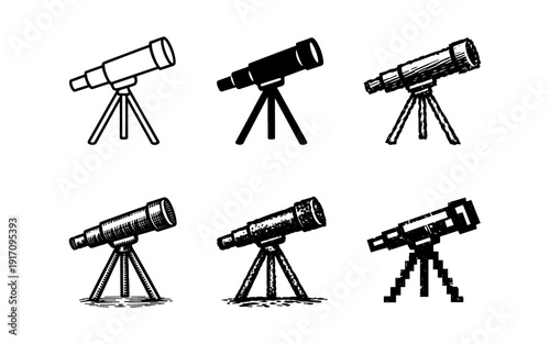 Collection of six different telescope icons and illustrations on a white background
