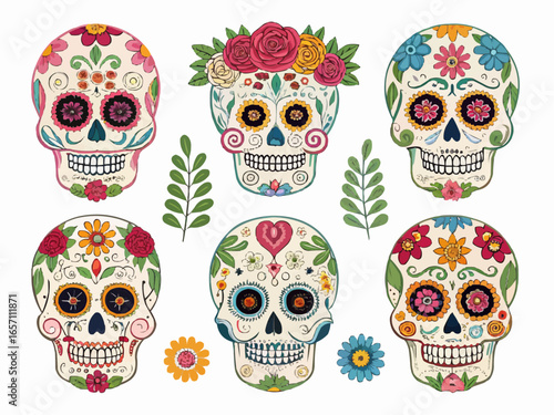 Collection of six sugar skulls decorated with colorful flowers and foliage on a white background art piece