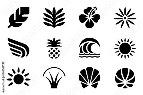 Collection of Tropical and Nature-Inspired Icons: Feather, Palm, Hibiscus, Sun, Wave, Pineapple, Shells