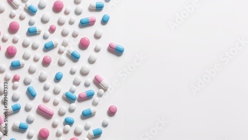 Colored pills and tablets in close view, creating bright pharmaceutical background. Macro medical texture for healthcare, medicine, treatment, pharmacy and drug packaging concepts with copy space.