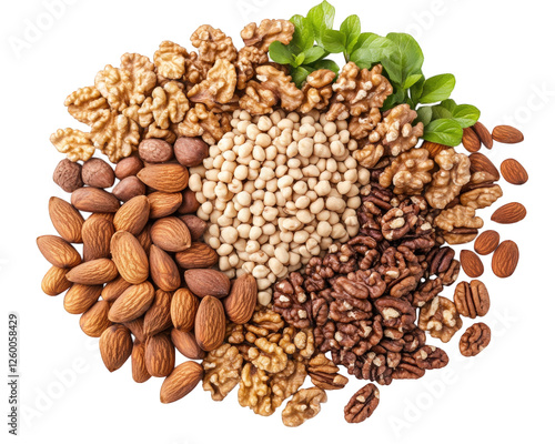 colorful assortment of nuts including almonds, walnuts, and pecans, showcasing healthy fats and nutrients. Perfect for snacking or adding to dishes