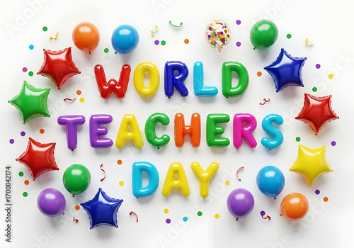 Colorful Balloons and Confetti for World Teachers Day Celebration with Festive Decoration, School Education, Greeting Card and Appreciation Theme