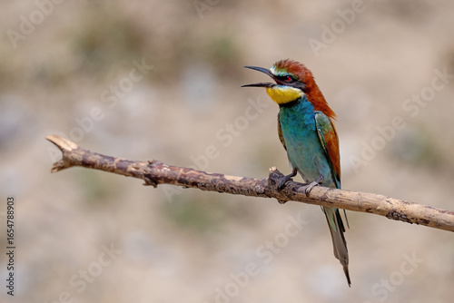 Colorful bird outdoors and wildlife. European bee-eater (Merops apiaster) in natural habitat. A strikingly beautiful colorful bird that can fly very well and winters in Africa as a migratory bird.