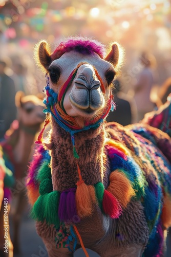 Colorful camel portrait at a festive gathering in the desert during golden hour