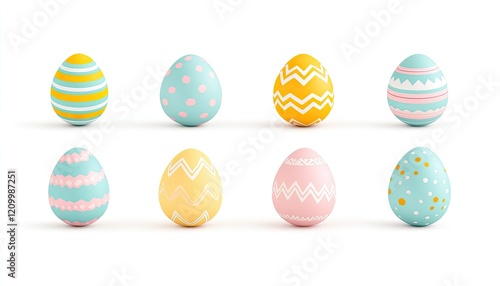 Colorful decorated Easter eggs arranged in a row on a white background, symbolizing spring festivities