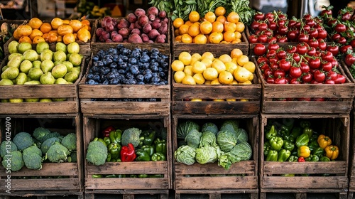 Colorful Display of Fresh Vegetables and Fruits at Market Stall