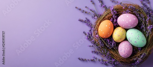 Colorful Easter eggs in a lavender nest against a violet background festive holiday design with ample space for text or messages