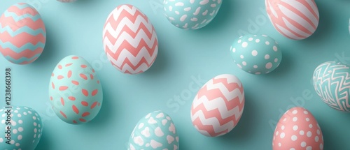 Colorful Easter eggs in pastel shades of pink and blue are arranged on a light blue surface, showcasing various patterns perfect for spring festivities