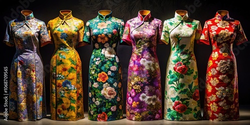 Colorful Floral Dresses, Mandarin Collar, Low Light, Fashion Photography