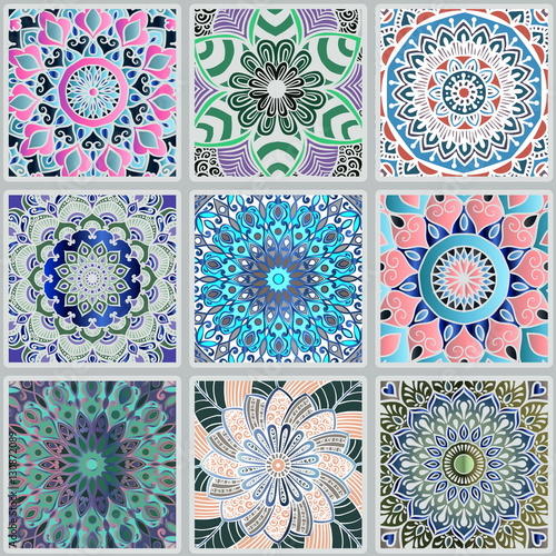 Colorful floral seamless pattern from squares with mandala in patchwork boho chic style, in portuguese and moroccan motif