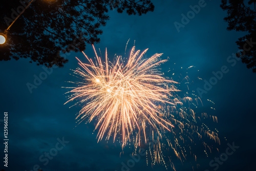 Colorful large fireworks on the dark sky background and silhouettes of trees. Abstract colored firework background with free space for text. fireworks light up the night sky