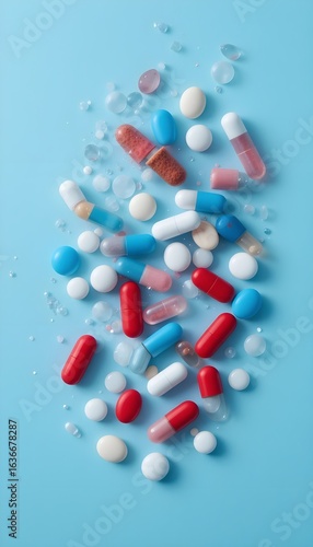 Colorful Medication Pills Arranged Near Edges on Blue Surface