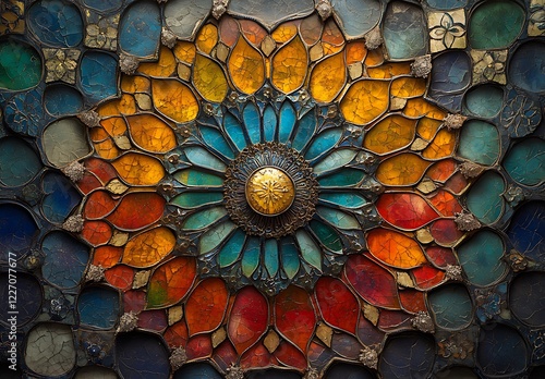 Colorful Mosaic Art Resembling a Flower with Golden Center and Multicolored Petals