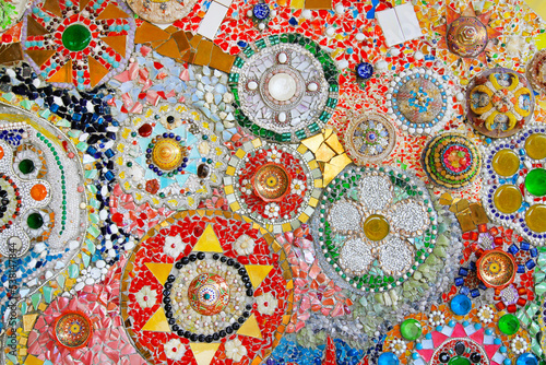 Colorful wall decorated with multicolor stone, gravel and gem for background at Wat Phra That Pha Son Kaew. Abstract of art design with broken tile for wallpaper.