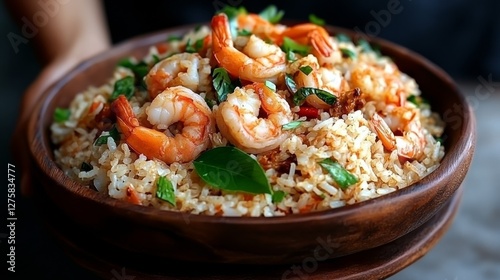 com tam, fragrant broken rice served with a side of grilled shrimp and fresh herbs