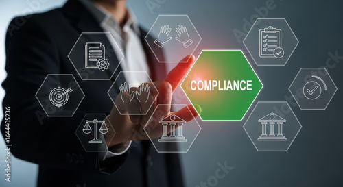 Compliance and Regulation A Hand Touching a Compliance Icon Surrounded by Regulatory Symbols Representing Legal Standards and Ethical Business Practices