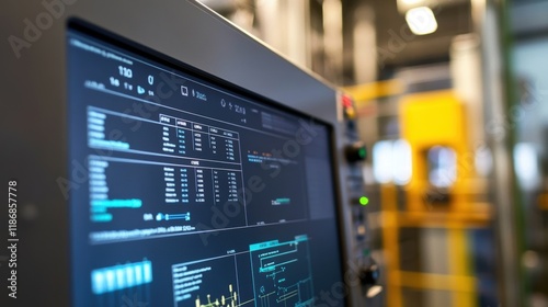Computer screen displaying industrial automation software, controlling machinery and processes in a modern manufacturing plant, optimizing production and efficiency