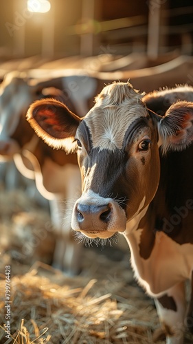 Concept Banner: cattle, farming, and agriculture industry. Cows in a herd enjoying hay in a barn with sunlight on a dairy farm