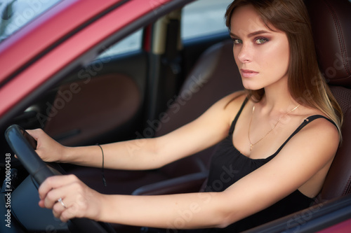 Concept: strong independent young woman in car. Beautiful serious girl sit behind the wheel at twilight. Outside look.