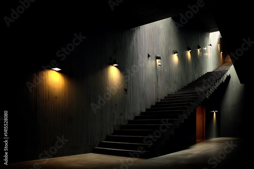 Concrete staircase illuminated by wall lights in a dark building.