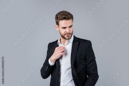 Confident and stylish. bearded man with business look. fashion and beauty. barbershop concept. mens wear. confident businessman. young handsome guy in office suit. stylish male wear formal clothes